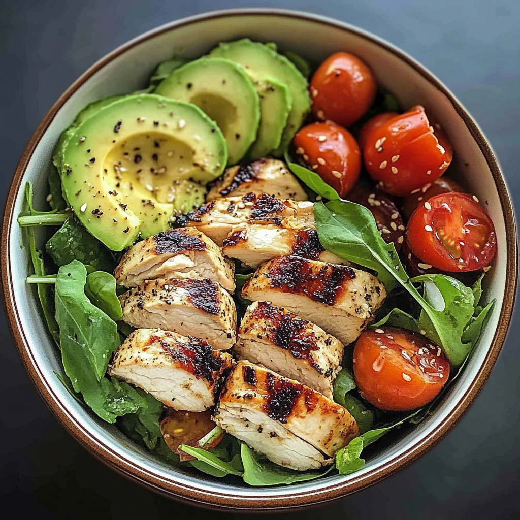 Enjoy a deliciously balanced Grilled Chicken & Avocado Power Salad packed with flavors and nutrients. Try it today for a healthy meal!